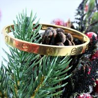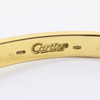 CARTIER, modèle « Love » T.19. Bracelet rigide et ouvrant en or jaune 750 millièmes décoré de motifs vis. (Usures) Signé et numéroté. Diamètre intérieur : 6,1 cm Poids brut : 36,6 g