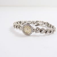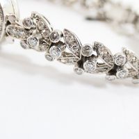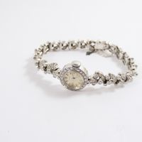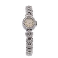Montre bracelet de dame en or gris 750 millièmes entièrement serti de diamants ronds taillés en huit-huit, la montre de forme ronde, cadran émaillé crème, index pour les heures, bracelet articulé, les maillons à décor feuillagés. Boucle en platine 850 millièmes. Lame et chaînette en or 750 millièmes. Mouvement mécanique. (Usures et fonctionnement non garanti) Signée SIGMA sur le cadran. Poids brut : 30,9 g