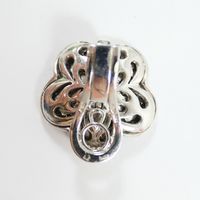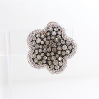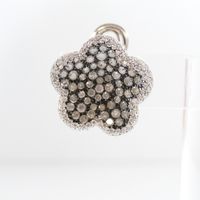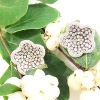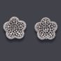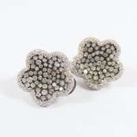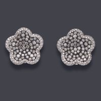 Paire de boucles d’oreilles en or gris 750 millièmes, chacune à décor de fleur entièrement sertie de diamants ronds de taille brillant, ceux du centre plus importants dans un sertissage noirci. Système à pinces ou pour oreilles percées. Hauteur : 2 cm Poids brut : 17,9