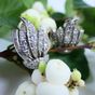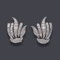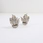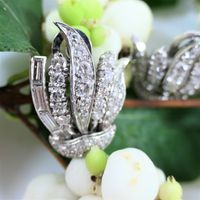Paire de boucles d’oreilles en platine 850 millièmes et raquettes en or gris 750 millièmes, chacune à décor de feuillage ornée de diamants rectangulaires et ronds taillés en huit-huit ou de taille brillant. (Usures) Système à pinces. Hauteur : 2,4 cm Poids brut : 15 g E) Art524bis du CGI, al.C