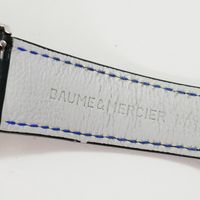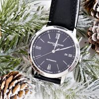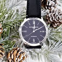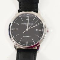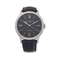BAUME & MERCIER, Classima. Montre de forme ronde. Référence 65832. Boîtier en acier signé et numéroté 6349554. Cadran noir à index et chiffres romains appliqués, aiguilles acier, guichet date à 3h. Mouvement mécanique à remontage automatique signé. Diamètre : 42 mm environ. Bracelet en cuir avec boucle ardillon en acier signée. Sans écrin ni papiers.