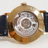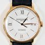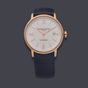 BAUME & MERCIER, Classima. Montre de forme ronde. Référence 65707. Boîtier en or rose 750 millièmes signé et numéroté 5429653. Cadran blanc à index et chiffres romains appliqués, aiguilles dorées, guichet date à 3h. Mouvement mécanique à remontage automatique signé. Diamètre : 39 mm environ. Bracelet en cuir avec boucle ardillon en or rose 750 millièmes signée. Poids brut : 57,1 g. Sans écrin ni papiers.