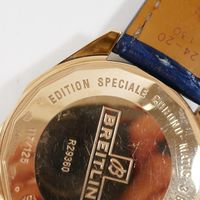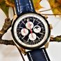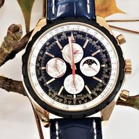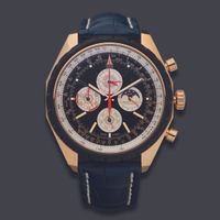 BREITLING, Chrono-Matic. Montre d’homme chronographe à complications. Référence R29360. Boîtier en or rouge 750 millièmes signé et numéroté 2453563. Édition limitée 117/125. Cadran noir à quatre sous-compteurs, index appliqués. Mouvement mécanique à remontage automatique. Diamètre : 48 mm environ. Bracelet en cuir (*) avec boucle ardillon en or rouge 750 millièmes signée. Poids brut : 197,2 g. Sans écrin ni papiers. Facture d’achat d’occasion en date du 15/01/2020.