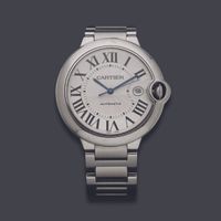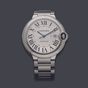 CARTIER, Ballon Bleu. Montre de forme ronde. Référence 3765. Boîtier en acier signé et numéroté 739054YX. Cadran guilloché argenté à chiffres romains, aiguilles glaives bleuies. Mouvement mécanique à remontage automatique. Diamètre : 42 mm environ. Bracelet en acier intégré avec boucle déployante signée, taille : 18 cm environ. Écrin signé et maillon supplémentaire, sans papiers.