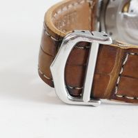 CARTIER, Pasha. Montre de forme ronde. Référence 2379. Boîtier en acier signé et numéroté 97615CD. Cadran guilloché argenté, aiguilles glaives bleuies luminescentes, guichet date à 4h. Traces de corrosions. Mouvement mécanique à remontage automatique. Diamètre : 39 mm environ. Bracelet en cuir (*) non signé avec boucle déployante en acier signée. Sans écrin ni papiers.