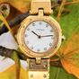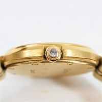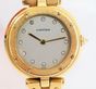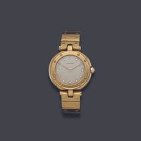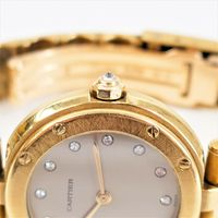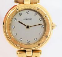 CARTIER, Santos Vendôme. Montre de forme ronde. Référence 81915. Boîtier en or jaune 750 millièmes signé et numéroté 01606. Cadran gris à index diamants, aiguilles glaives dorées. Mouvement quartz. Diamètre : 27 mm environ. Bracelet en or jaune 750 millièmes avec boucle déployante signée, taille : 14,6 cm environ. Poids brut : 71,08 g. Sans écrin ni papiers. Non fonctionnante, révision à prévoir.