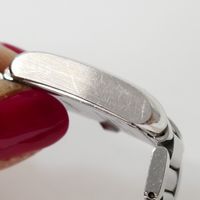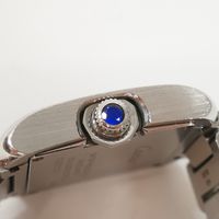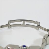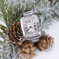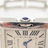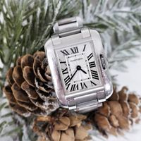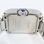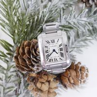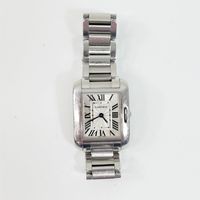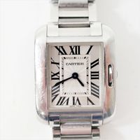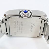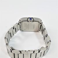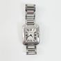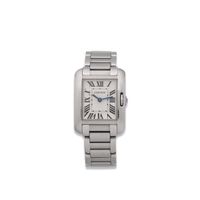 CARTIER, Tank Anglaise. Montre de forme rectangulaire. Référence 3485. Boîtier en acier signé et numéroté 129763TX. Cadran argenté guilloché à chiffres romains et aiguilles glaives bleuies. Mouvement quartz. Dimensions : 23 × 30 mm environ. Bracelet en acier avec boucle déployante signée, taille : 14 cm environ. Sans écrin ni papiers.
