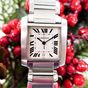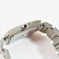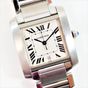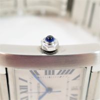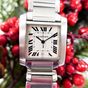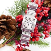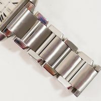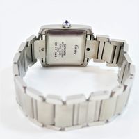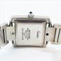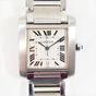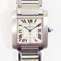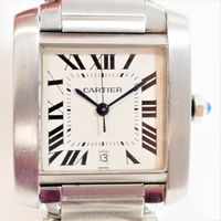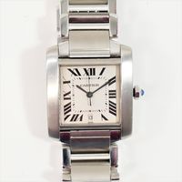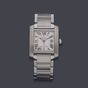 CARTIER, Tank Française. Montre de forme rectangulaire. Référence 2302. Boîtier en acier signé et numéroté CC481149. Cadran argenté guilloché à chiffres romains, aiguilles glaives bleuies et guichet date à 6h. Mouvement mécanique à remontage automatique. Dimensions : 28 × 35 mm environ. Bracelet en acier intégré avec boucle déployante signée, taille : 18 cm environ. Sans écrin ni papiers.