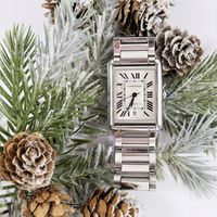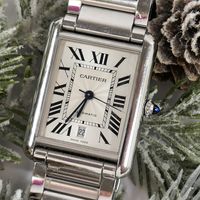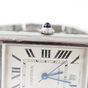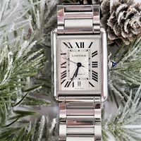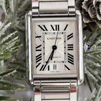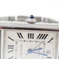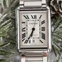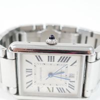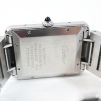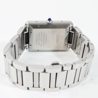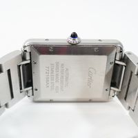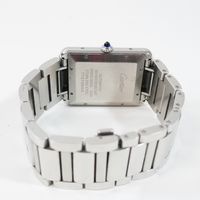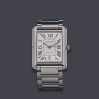 CARTIER, Tank Solo XL. Montre de forme rectangulaire. Référence 4324. Boîtier en acier signé et numéroté 772158AX. Cadran guilloché gris à chiffres romains et aiguilles glaives bleuies, guichet date à 6h. Mouvement mécanique à remontage automatique. Dimensions : 31 x 41mm environ. Bracelet en acier avec boucle déployante signée, taille : 16 cm environ. Boîte, surboîte, maillon supplémentaire et carte de garantie en date du 18/06/2021.