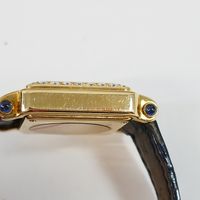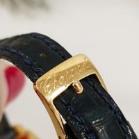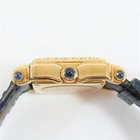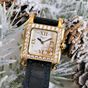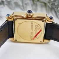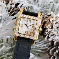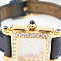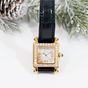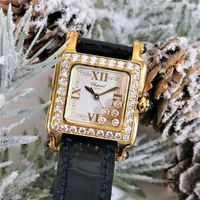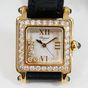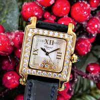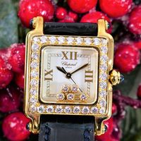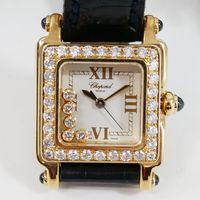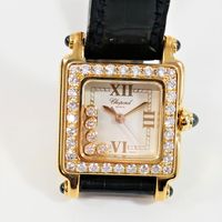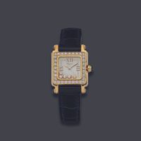 CHOPARD, Happy Sport. Montre de forme carrée. Référence 5258. Boîtier en or jaune 750 millièmes signé et numéroté 798881. Lunette sertie de diamants. Cadran blanc à chiffres romains, aiguilles glaives dorées. Diamants mobiles sous verre. Mouvement quartz. Dimensions : 23 × 23 mm environ. Bracelet en cuir signé avec boucle ardillon en or jaune 750 millièmes signée. Poids brut : 42,6 g. Sans écrin ni papiers. Non fonctionnante, révision à prévoir.