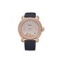 CHOPARD, Happy Sport. Montre de forme ronde. Référence 4183. Boîtier en or rose 750 millièmes signé et numéroté 1247635 109/1000. Lunette sertie de diamants. Cadran nacré à chiffres romains appliqués, aiguilles glaives dorées, guichet date à 4h. Diamants mobiles sous verre. Mouvement quartz. Diamètre : 36 mm environ. Bracelet en tissu signé avec boucle ardillon en or rose 750 millièmes signée. Poids brut : 84 g. Sans écrin ni papiers.
