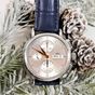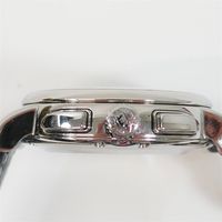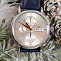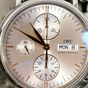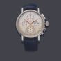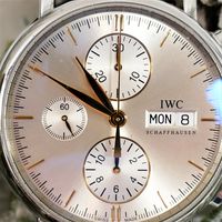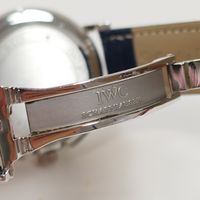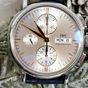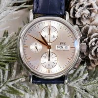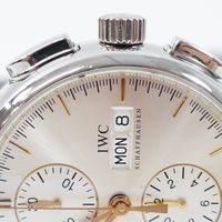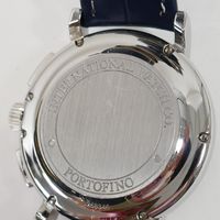 IWC, Portofino. Montre de forme ronde chronographe. Boîtier en acier signé et numéroté 3258346. Cadran argenté à trois sous-compteurs, index appliqués, guichet jour et date à 3h. Mouvement mécanique à remontage automatique signé. Diamètre : 40 mm environ. Bracelet en cuir à boucle déployante en acier signée. Sans écrin ni papiers.
