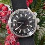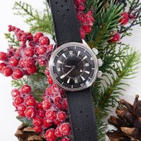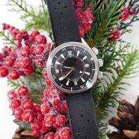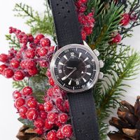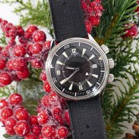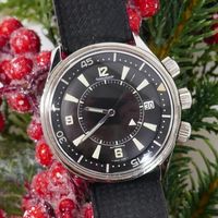 JAEGER-LECOULTRE, Memovox Polaris. Montre de forme ronde de plongée à alarme. Référence E859. Boîtier en acier. Cadran noir à index et aiguilles luminescents, lunette interne tournante. Mouvement mécanique à remontage automatique. Diamètre : 42 mm environ. Bracelet Tropic avec boucle ardillon non signée. Sans écrin ni papiers. Produite de 1968 à 1972, la Memovox dite Polaris, est une montre rare de chez Jaeger-Lecoultre, environ 1714 exemplaires ont été produits durant les quatre années de production. Avoir la fonction alarme sur une montre de plongée est une complication très inhabituelle dans la production horlogère. Le boîtier a dû être spécialement revu et dessiné pour pouvoir intégrer une alarme suffisamment puissante pour être entendue sous l’eau.