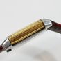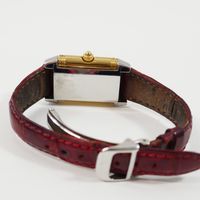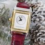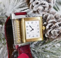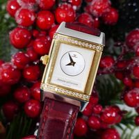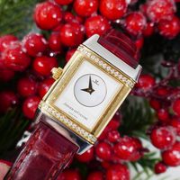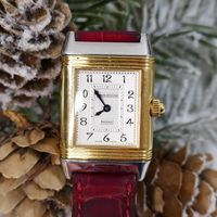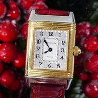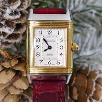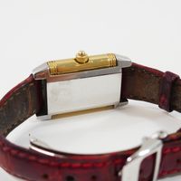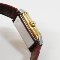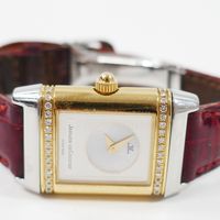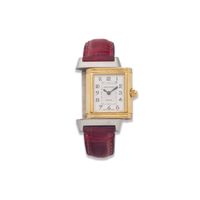 JAEGER-LECOULTRE, Reverso. Montre de forme rectangulaire réversible. Boîtier en acier numéro 1947636. Boîtier central en or jaune 750 millièmes avec brancards sertis de diamants. Côté verso : Cadran argenté à chiffres arabes, aiguilles glaives bleuies. Coté recto : cadran nacré à aiguilles dauphines dorées. Mouvement mécanique à remontage manuel. Dimensions : 21 × 33 mm environ. Bracelet en cuir (*) avec boucle déployante en acier signée. Poids brut : 40,5 g. Boîte, surboîte, sans papiers. E)Art524bis du CGI, al.C