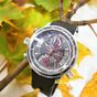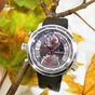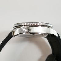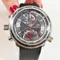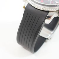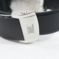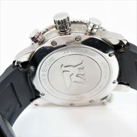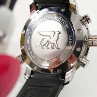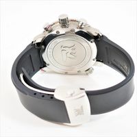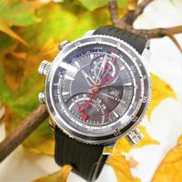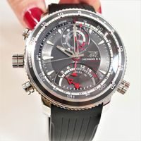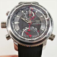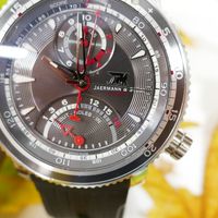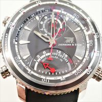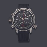 JAERMANN & STÜBI, Time to play. Montre de forme ronde pour golf. Boîtier en acier signé et numéroté TP.07.017. Cadran gris à deux sous- compteurs, index et aiguilles luminescents, lunette tournante. Mouvement mécanique à remontage automatique. Diamètre : 44 mm environ. Bracelet en caoutchouc avec boucle déployante en acier signée. Sans écrin ni papiers.