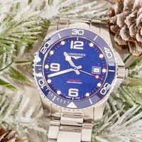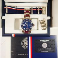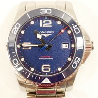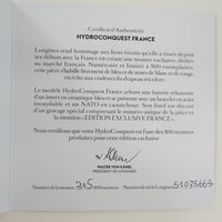 LONGINES, Hydroconquest édition exclusive France. Montre de forme ronde. Référence L3.781.4. Boîtier en acier signé et numéroté 51075663. Cadran bleu à index et chiffres arabes luminescents, guichet date à 3h. Mouvement mécanique à remontage automatique. Diamètre : 41 mm environ. Bracelet en acier avec boucle déployante signée, taille : 17 cm environ. Boîte, surboîte, 3 maillons supplémentaires, un bracelet NATO, carte de garantie en date du 21/08/2021.