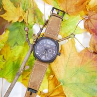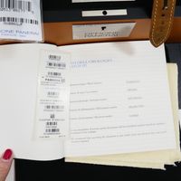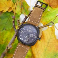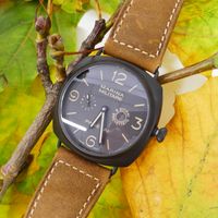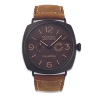 PANERAI, Marina Militare 8 Jours Composite. Montre de plongée forme coussin. Référence OP6806. Boîtier en céramique signé et numéroté DT1853601. Cadran marron à index et aiguilles luminescents. Mouvement mécanique à remontage manuel, réserve de marche 8 jours. Diamètre : 46 mm. Bracelet en cuir avec boucle ardillon en céramique signée. Boîte, surboîte, bracelet supplémentaire et certificat de garantie d’origine.