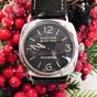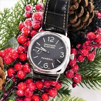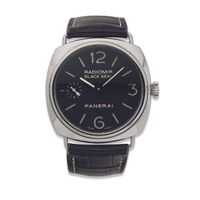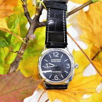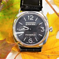 PANERAI, Radiomir Black Seal. Montre de forme coussin de plongée. Référence OP6644. Boîtier en acier signé et numéroté PB544187. Cadran noir dit « sandwich » à index et aiguilles luminescents. Mouvement mécanique à remontage manuel signé. Diamètre : 45 mm environ. Bracelet en cuir (*) signé avec boucle ardillon en acier signée. Boîte, surboîte, notice et certificat COSC.