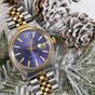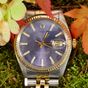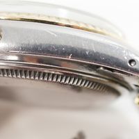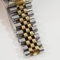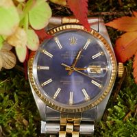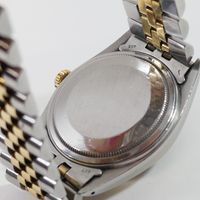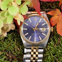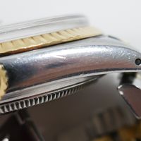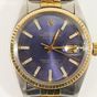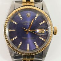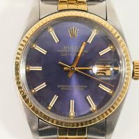 ROLEX, Datejust. Montre de forme ronde. Référence 16013. Boîtier en acier numéroté 5994761, lunette cannelée et couronne en or jaune 585 millièmes. Impact sur le fond de la boîte. Cadran bleu à index appliqués, points et aiguilles luminescents, guichet date à 3h. Mouvement mécanique à remontage automatique. Calibre 3035. Révision à prévoir. Diamètre 36 mm environ Bracelet Jubilee en acier et or jaune 585 millièmes avec boucle déployante signée référence 62523H-14, taille : 18 cm environ. Poids brut : 96,6 g. Sans écrin ni papiers. Non poinçonnable.