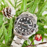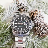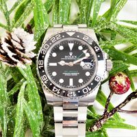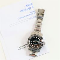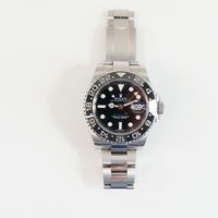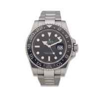 ROLEX, GMT-Master II. Montre de forme ronde à double fuseau horaire. Référence 116710LN. Boîtier en acier signé et numéroté 00V7Q344. Cadran noir à index et aiguilles luminescents, guichet date à 3h. Mouvement mécanique à remontage automatique signé. Calibre 3186. Diamètre : 40 mm environ. Bracelet Oyster avec boucle déployante signée, taille : 16 cm environ. Facture d’achat d’occasion du 26/10/2012. Sans écrin.