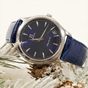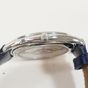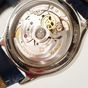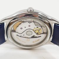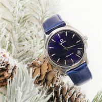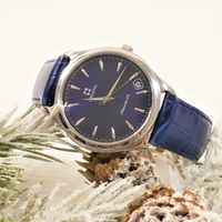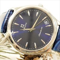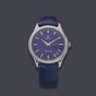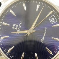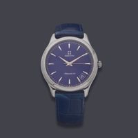 ZENITH, Automatic 670. Montre de forme ronde. Boîtier en acier signé et numéroté 90/010040 670. Cadran guilloché bleu à index appliqués, aiguilles luminescentes, guichet date à 4h. Mouvement mécanique à remontage automatique signé. Calibre 670. Diamètre : 36 mm environ. Bracelet en cuir (*) avec boucle déployante en acier non signée. Sans écrin ni papiers