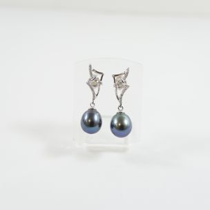 200 / 250 €Paire de pendants d'oreilles en or gris 750 mil, ajourés, rehaussés de diamants, retenant une perle de culture en pampille (Diam perle : 7,6 mm ; Haut Boucle d'oreilles : 2,5 cm environ). 3,4 g brut.