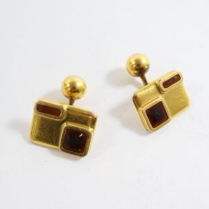 10 / 20 €Paire de boutons de manchettes en métal doré à plateau rectangulaire rehaussé de motifs émaillés (Dim : 1,5 x 2 cm environ) (Rayures).