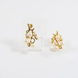 300 / 450 €Paire de boucles d'oreilles en or 750 mil ajouré, entrelacées, rehaussées de perles de culture et diamants (Dim : 2,6 x 1,7 cm environ). 5,3 g brut.