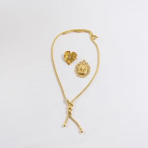 950 / 1 150 €Lot en or 750 mil composé : d'un Collier maillons palmier centré d'un motif serpent, les yeux diamantés (Larg : 2,5 mm ; Long : 42 cm environ), d'une broche cœur guillochée centrée d'une perle de culture (Dim : 2,3 x 2,2 cm environ) et d'un pendentif ovale ajouré centré d'un perle de culture (Dim hors bélière : 25 x 30 mm environ). 15,4 g brut.