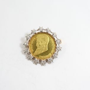 800 / 1 100 €Broche en or 750 mil composée d'une médaille en or 900 mil de Theodor HERL dans un entourage d'étoiles diamantées en or gris 750 mil (Diam : 3,7 cm). 14,1 g brut.