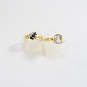 220 / 300 €2 bagues en or 750 mil dont 1 ornée d'une topaze facettée égrisée (TDD : 54) et 1 centrée d'une ligne de 3 saphirs (TDD : 53 ; monture coupée). 4,2 g brut.