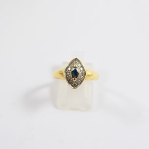 200 / 250 €Bague en or 750 mil à chaton central losangique (Dim : 1,1 x 0,8 cm environ) centré d'un saphir navette entouré de diamants (TDD : 53). 2,8 g brut.