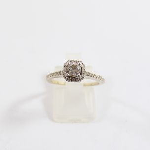 350 / 500 €Bague en or gris 750 mil à chaton carré (Dim : 7 mm) orné d'un diamant (environ 0,30 ct) entouré et épaulé de diamants (TDD : 52,5). 2,9 g brut.