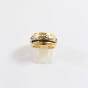 1 000 / 1 300 €Large anneau en or 750 mil centré d'un anneau tournant rehaussé de 6 diamants (environ 0,70 ct au total) (chiffré) (TDD : 53). 15,3 g brut.