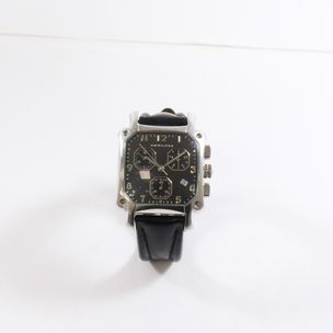120 / 180 €Montre en acier sur bracelet cuir usagé, chronographe à boîtier carré (Dim : 35 mm environ), cadran noir à chiffres arabe, 3 compteurs secondaires et guichet dateur à 4h, HAMILTON "Lloyd" mouvement quartz (petit choc sur le verre, manque passant).
