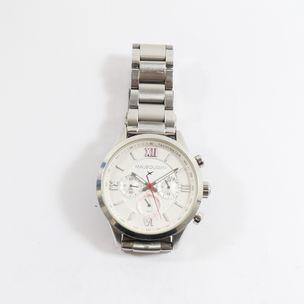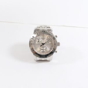 120 / 180 €Bracelet -montre d'homme en acier, chronographe à boîtier rond et lunette tournante (Diam : 39 mm), cadran argenté à 3 compteurs secondaires et guichet dateur à 4h, tour de bras à plaquettes acier articulées (Long : 17 cm environ), TISSOT "PRS 200" mouvement quartz.