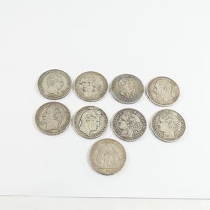 9 pièces en argent dont 5 de 5 frcs français (1 Na