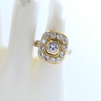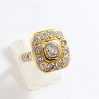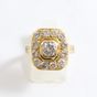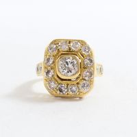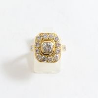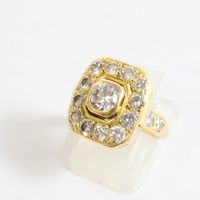 Bague en or 750 mil à chaton rectangulaire arrondi centré d'un diamant (environ 0,50 ct) entouré et épaulé de diamants (Dim chaton : 1,6 x 1,4 cm environ ; TDD : 51). 7 g brut.