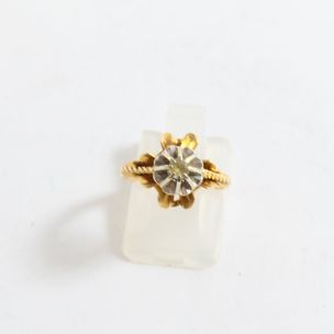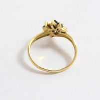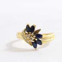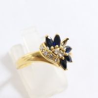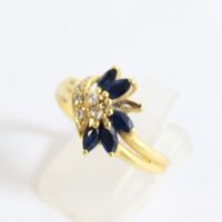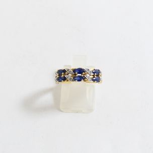 Bague en or 750 mil ornée de saphirs navette (manque une pierre) rehaussés de 6 diamants (TDD : 54,5). 3,2 g brut.