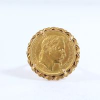 Bague en or 750 mil ornée d'une pièce de 20 frcs en or 900 mil (Napoleon III) (TDD : 54). 11,5 g.