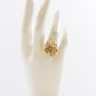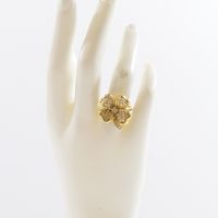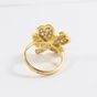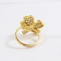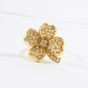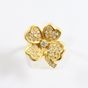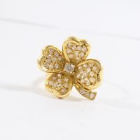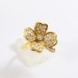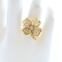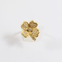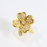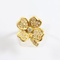 Bague trèfle à quatre feuilles diamantées en or 750 mil (égrisures, 2 pierres accidentées) (Dim trèfle : 2 x 2,4 cm environ ; TDD : 55,5). 6,9 g brut.