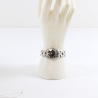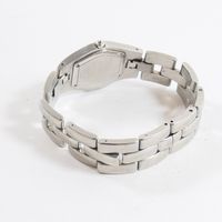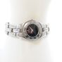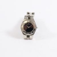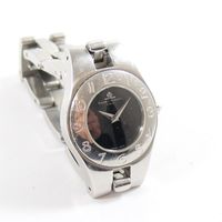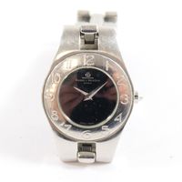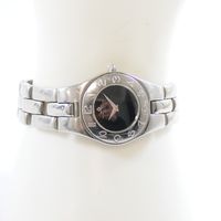 Bracelet-montre de dame en acier, boîtier rond à large lunette gravée de chiffres arabe (Diam : 25 mm environ), cadran muet noir, tour de bras à plaquettes acier articulées (Long : 16 cm environ), BAUME et MERCIER, Linéa, mouvement quartz (rayures d'usage).