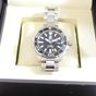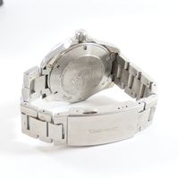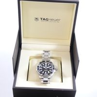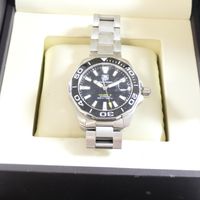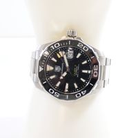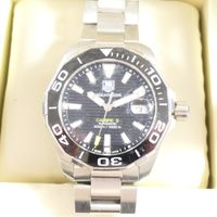 Bracelet-montre d'homme en acier, boîtier rond à lunette tournante en céramique (Dim : 40 mm), cadran noir rainuré à index et guichet dateur, tour de bras à plaquettes articulées acier (Long : 19 cm environ) TAG HEUER "Aquaracer, calibre 5" mouvement automatique (dans son écrin, sa surboîte, son livret, sa garantie et 3 maillons en sus) (rayures d'usage, verre à nettoyer).
