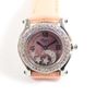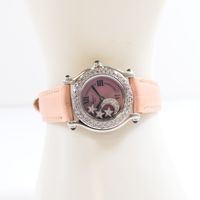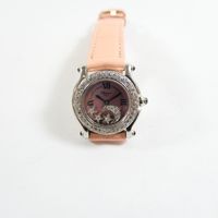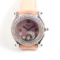 Montre de dame en acier, boîtier rond à lunette ornée de 2 rangs de diamants (probablement rapportés ; Diam : 26 mm), cadran nacré à chiffres romains orné d'une lune et de 3 étoiles diamantées mobiles, CHOPARD "Happy Sport" mvt quartz (boucle ardillon acier siglée).