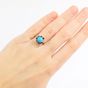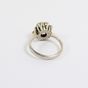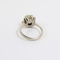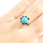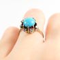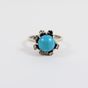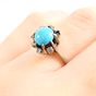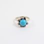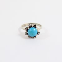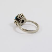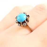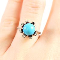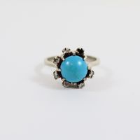 Bague : en or gris 750 mil. À chaton rond orné d'une turquoise cabochon dans un entourage de diamants brillantés et 16/16. (TDD : 50). (Trace de mise à taille) (Pierre manquante) (Salissures). 5 g. brut.