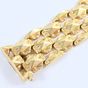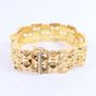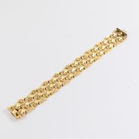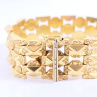 Bracelet manchette : en or 750 mil. À maille articulée géométrique ajourée. Fermoir cliquet à huit de sécurité. (Longueur : 19,5 cm environ) (Largeur : 2,1 cm environ). 34,8 g.