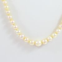 Collier : d'un rang de perles de culture : en chute (Diam. : de 2,8 à 7,1 mm environ). Fermoir cliquet en or gris 750 mil. Chaîne de sécurité. (Longueur : 43,5 cm environ. 12,4 g. brut.
