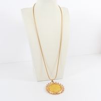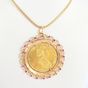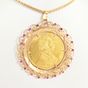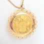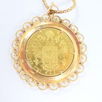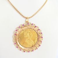 Collier : en or 750 mil. À maille popcorn. (Longueur : 65 cm environ), retenant un pendentif en or 750 mil. Centré d'une médaille représentant François-Joseph 1 er empereur d'Autriche (1830-1916). Entourée de pierres imitations rouges. (Diam. : 6,2 cm environ). Travail français. 36,4 g. brut.