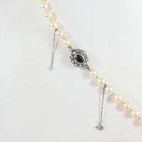 Collier d'un rang de perles de culture : en chute (Diam. : 6,3 à 9,5 mm environ). Fermoir en argent ornée d'une pierre verte dans un entourage de semences de perles. Chaînette de sécurité. (Longueur : 71 cm environ).