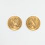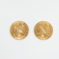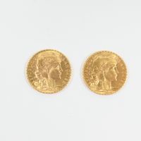 Deux pièces de monnaies : en or 900 mil. De 20 FRF datées 1910-1911. 13 g.